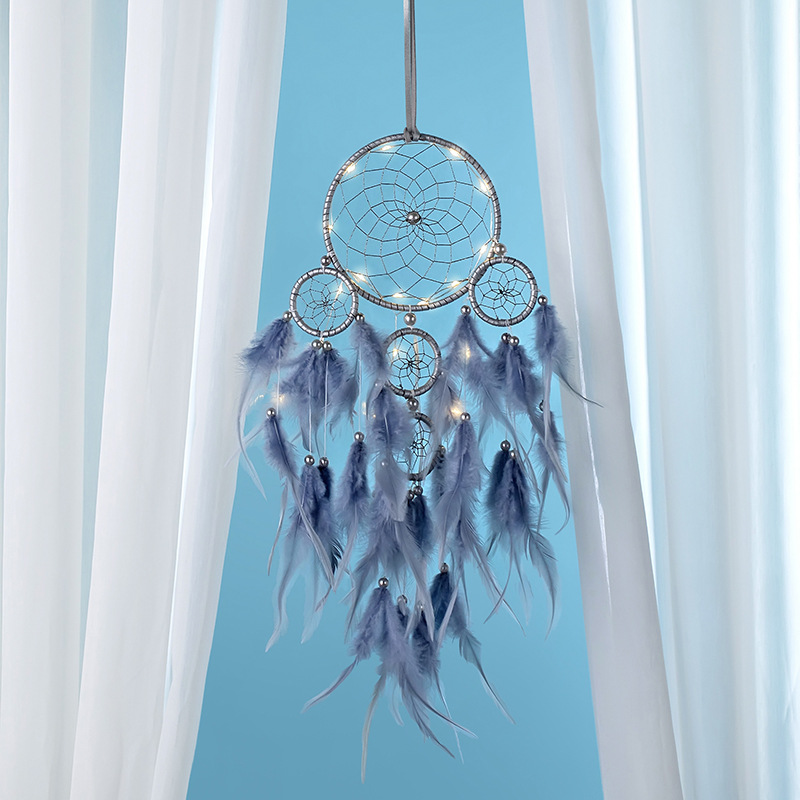 Avec ses 5 anneaux et ses plumes gris bleu orage, entrez dans la légende amérindienne. Vous allez profitez de ce bel objet ancestral pour apporter une ambiance CHALEUREUSE et ZEN au sein de votre pièce. Vous disposez de l’option avec ou sans lumière led. L’option Led permet à la tombée de la nuit de mettre en valeur votre attrape-rêves. Une nuit de rêve vous attend! Les amérindiens racontent que si vous accrochez un Attrape-rêve dans une chambre, il va durant vote sommeil emprisonner tous les cauchemars et laisser uniquement passer par sa toile les jolis rêves. Faites vous plaisir et faites plaisir avec ce bel attrape-rêves. Bénéficiez de PRIX toujours MINIS toute l’année!